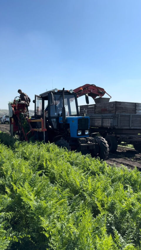 На полях группы компаний «Агрофирма «Слава картофелю» идет активная уборка моркови. Урожайность - под 100 тонн с гектара.